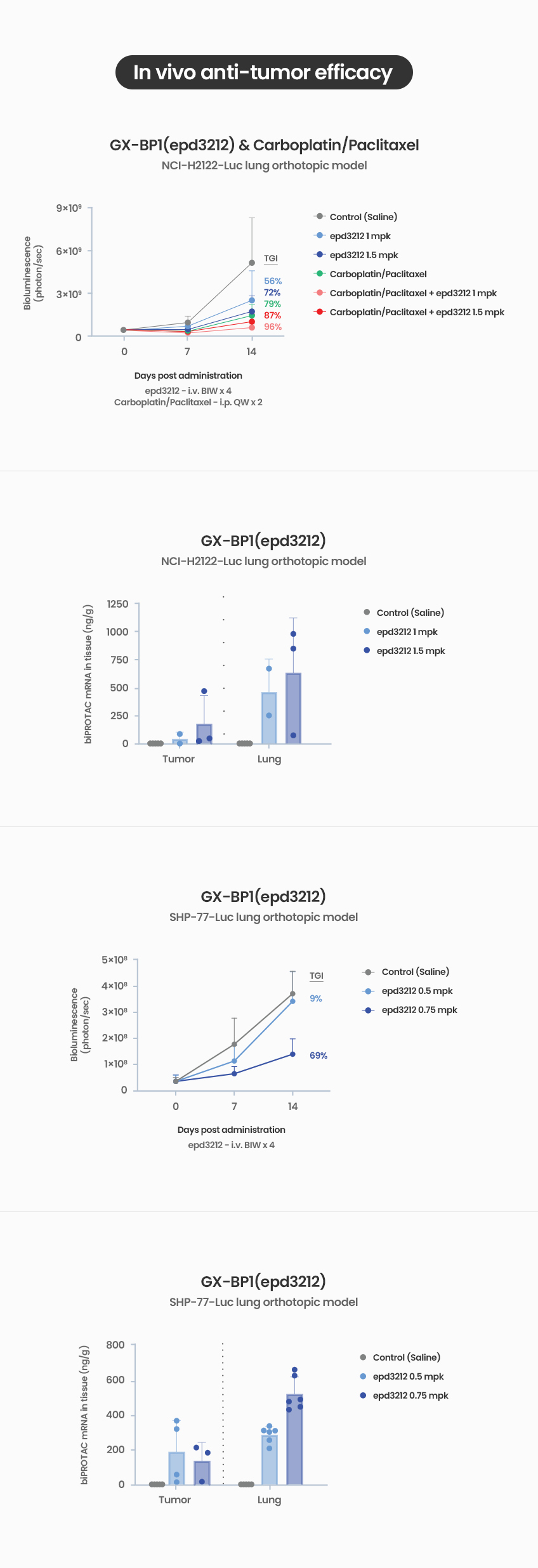 폐 표적 LNP 기반 SOX2 bioPROTACs를 정맥 투여한 전임상 연구에서, 두 가지 폐암 Xenograft 모델 모두에서 종양 내 mRNA 전달 및 항암 효과의 용량 의존적 증가 확인